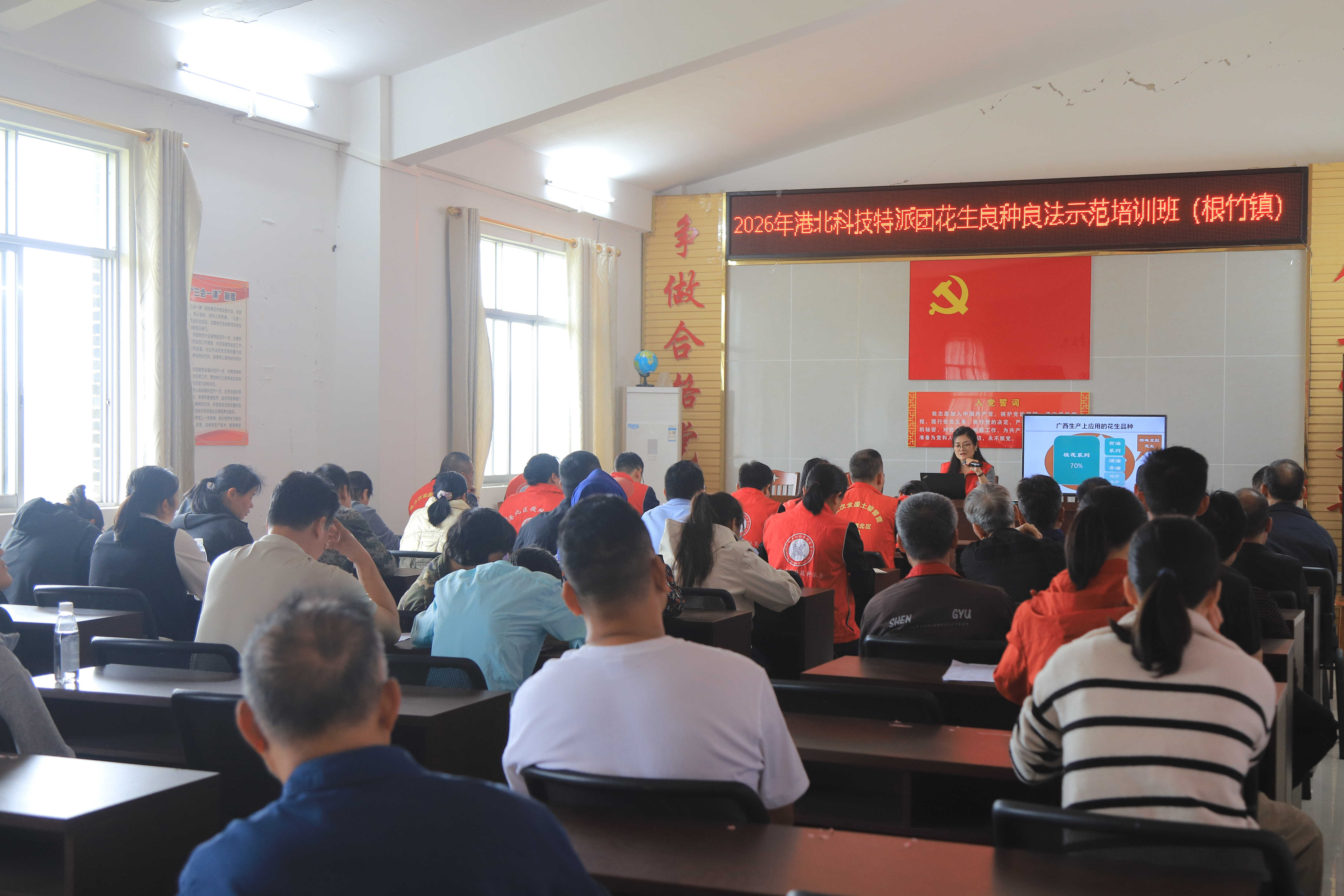 近来,广西大豆油料立异团队首席小组成员、港北区村庄科技特派员团花出工业组一行3人,在港北区根竹镇牵头组织了花生大面积高产创立专项训练班,县乡技能人员与培养户共63人参加了此次训练。