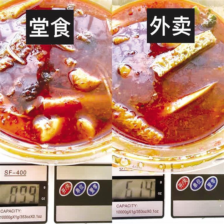 在金凤区庆丰街某麻辣烫店,记者堂食挑选了13元的麻辣烫,其中,包含西蓝花、金针菇、山药、面筋、蟹棒、鸡肉香肠6样菜品,煮熟后对菜品进行称重899克,汤汁充盈,蔬菜新鲜,汤底麻辣鲜香,麻辣烫的地道风味。然而,记者打开外卖平台后发现,同样的菜品选好后价格在21元左右。原以为可能是菜品重量不一样,没想到收到后餐品总重仅614克,较堂食同样的菜品减少285克,分量缩水近32%,价格却高于堂食约8元,味道也偏咸。